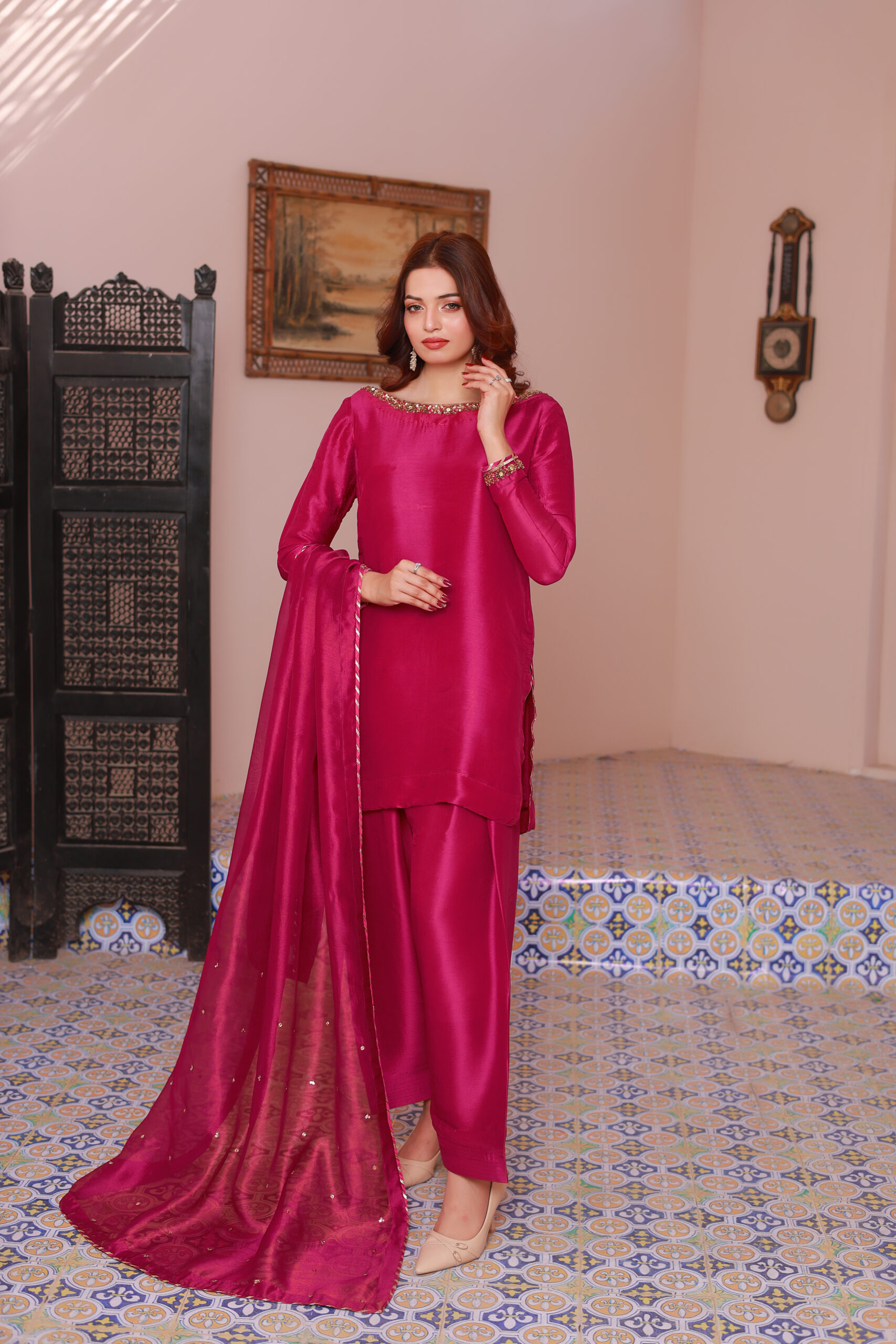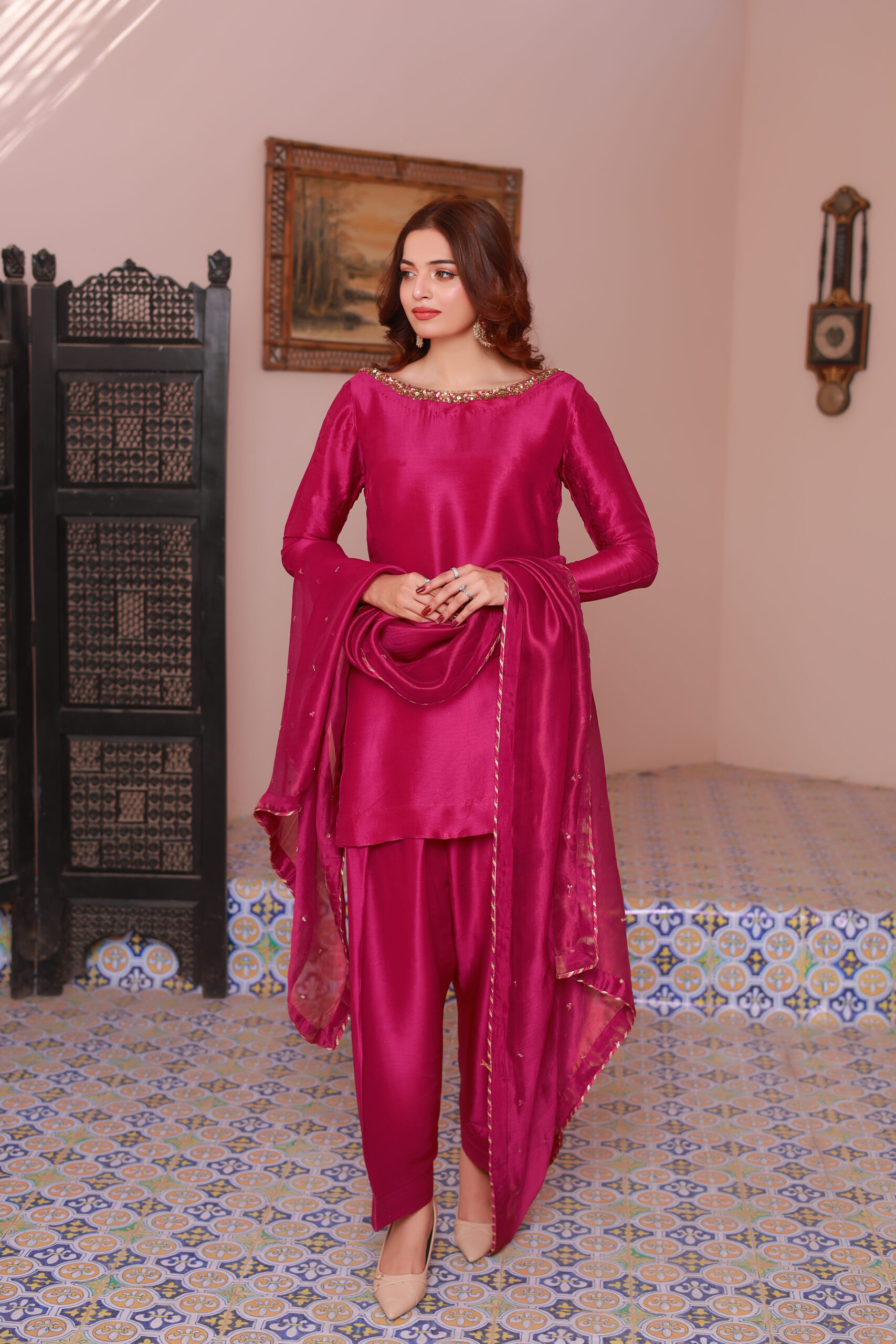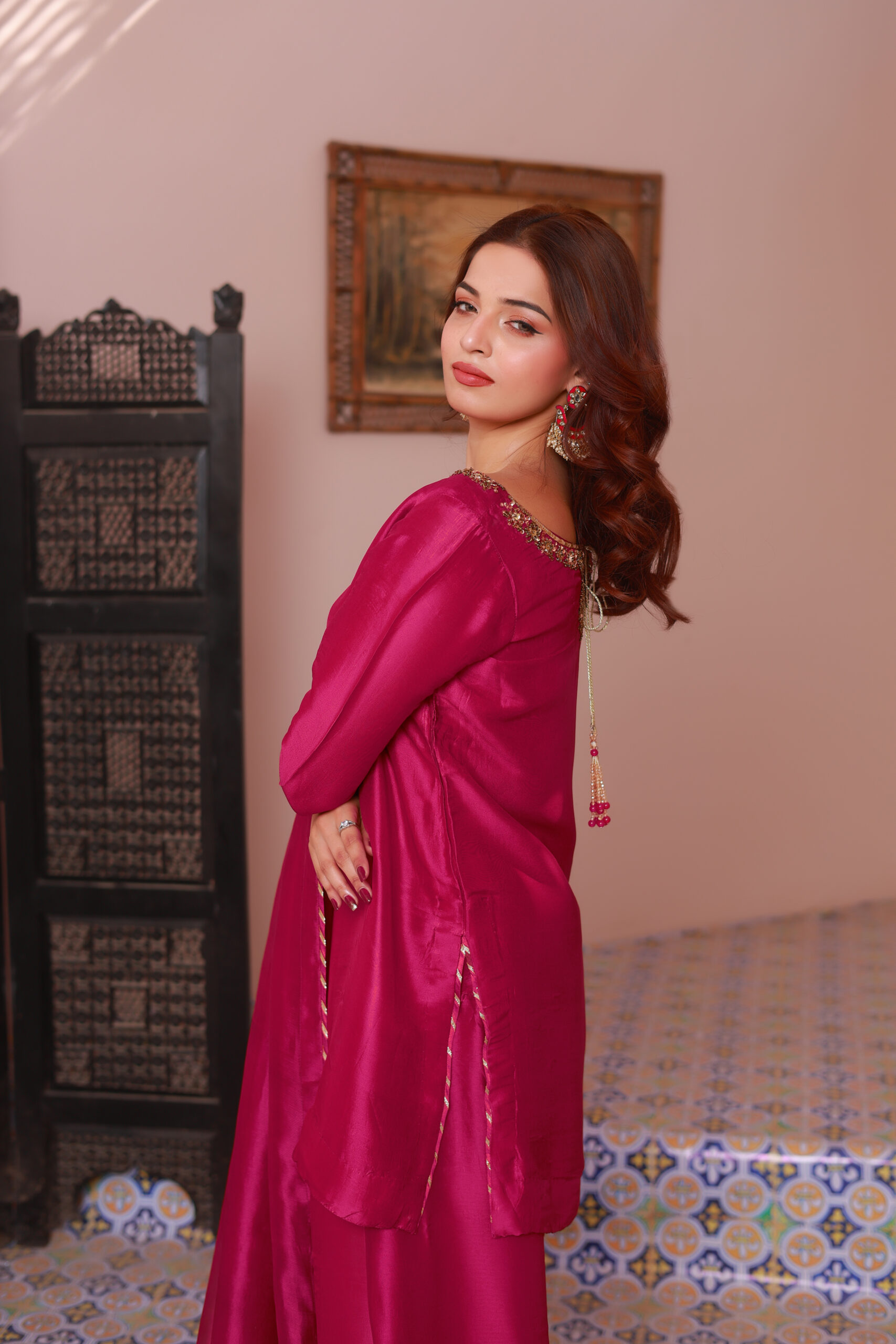 A vibrant pink shirt crafted from soft, flowing fabric, featuring intricate sequin work along the neckline, with a Hyderabadi neck from back, adding a touch of sparkle and elegance. The sequins are delicately arranged, catching the light and enhancing the overall charm of the garment. Paired with a traditional, comfortable farshi shalwar, the outfit blends contemporary style with classic sophistication. The shirt’s tailored fit and the fluid, relaxed silhouette of the shalwar make it ideal for both formal and semi-formal occasions. This ensemble is a perfect choice for a festive celebration or evening gathering, offering a balance of style, grace, and cultural appeal.